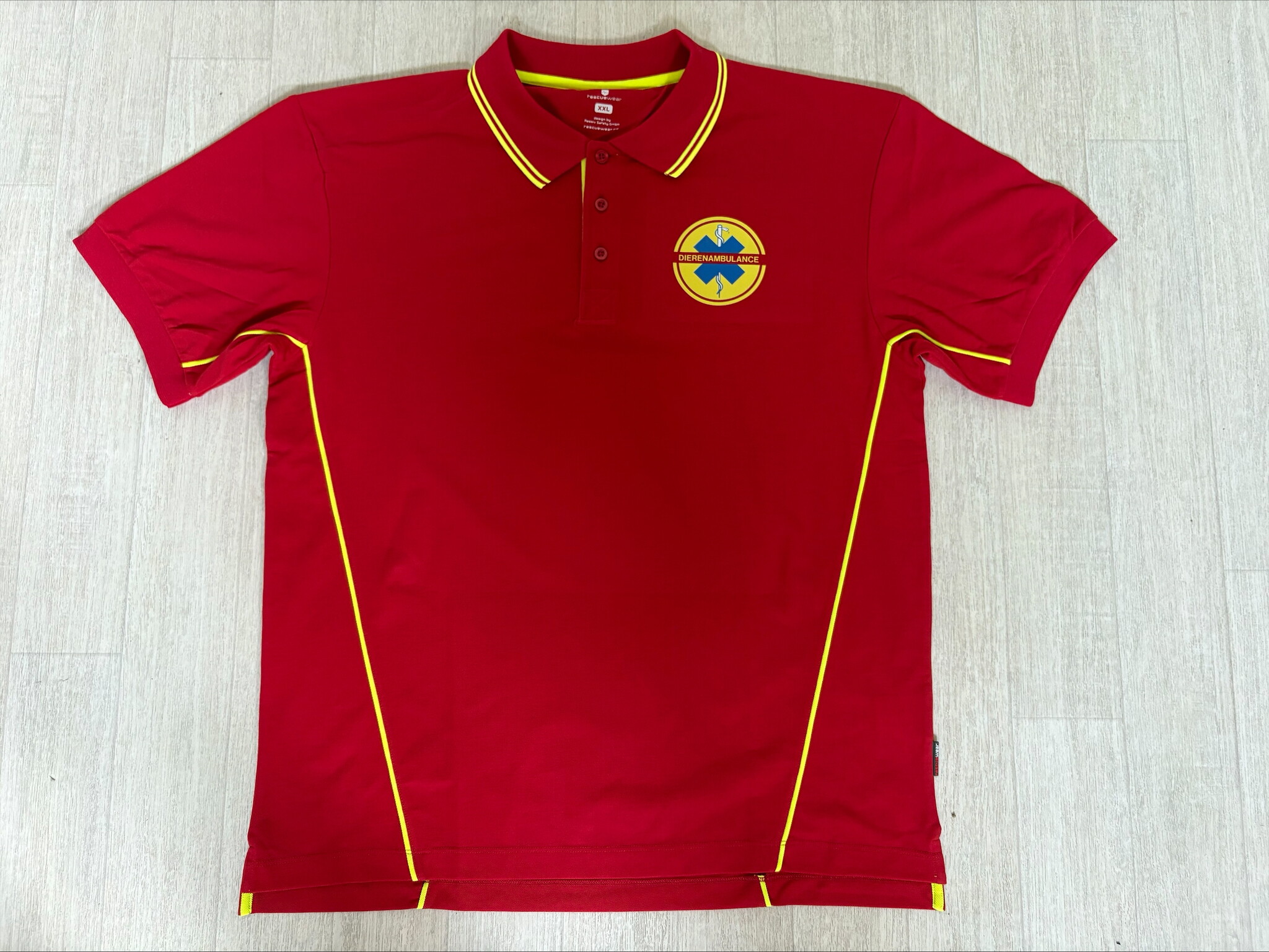 Poloshirt met korte mouw, 70% Recycled Polyester/30% Organic Cotton. Rood met neongele accenten Maten XXS-3XL Lees meer